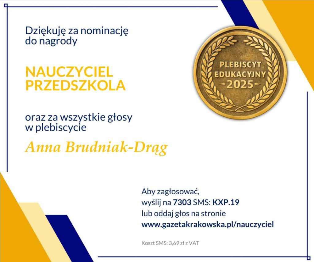 Bardzo serdecznie dziękujemy za nominację nauczyciela p. Anny Brudniak oraz dostrzeżenie jej zaangażowania, profesjonalizmu i pasji ! Głosowanie w plebiscycie rozpocznie się już we wtorek, 21 października. Wszystkie informacje o akcji można znaleźć w naszym serwisie internetowym pod adresem: www.gazetakrakowska.pl/nauczyciel