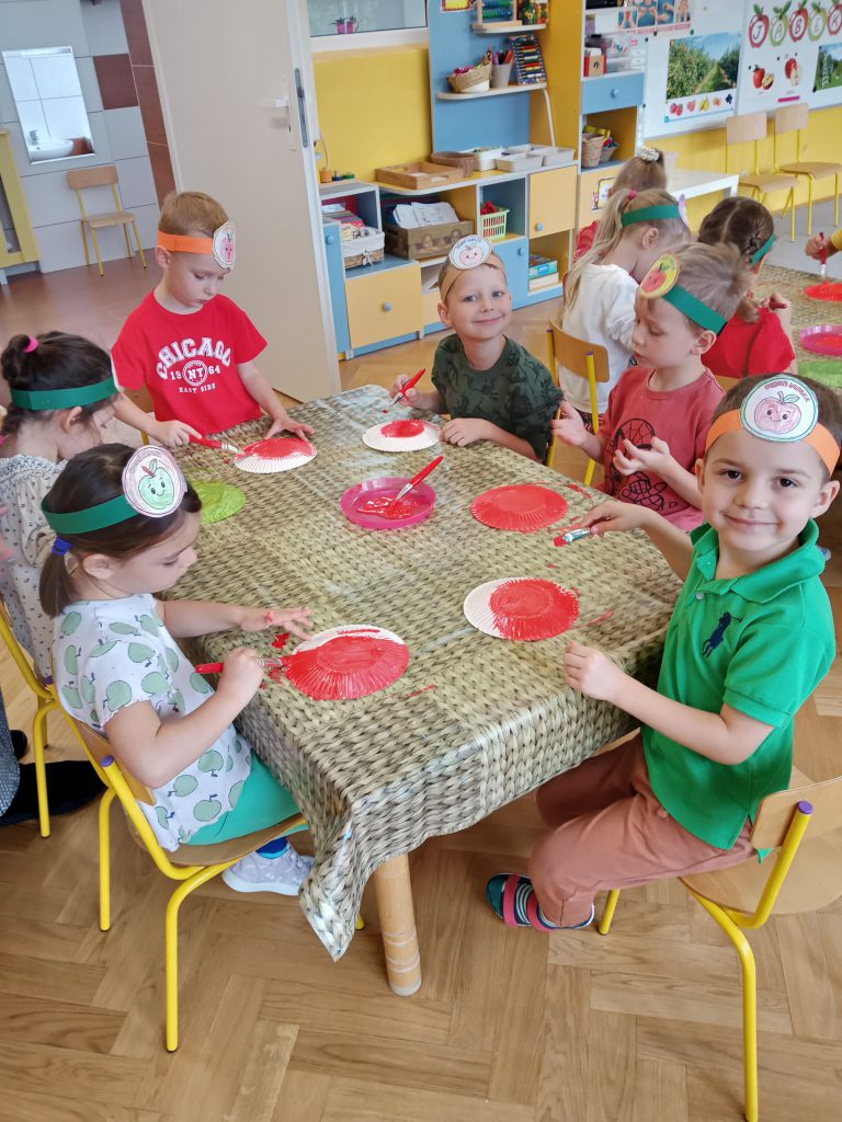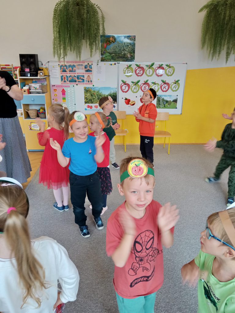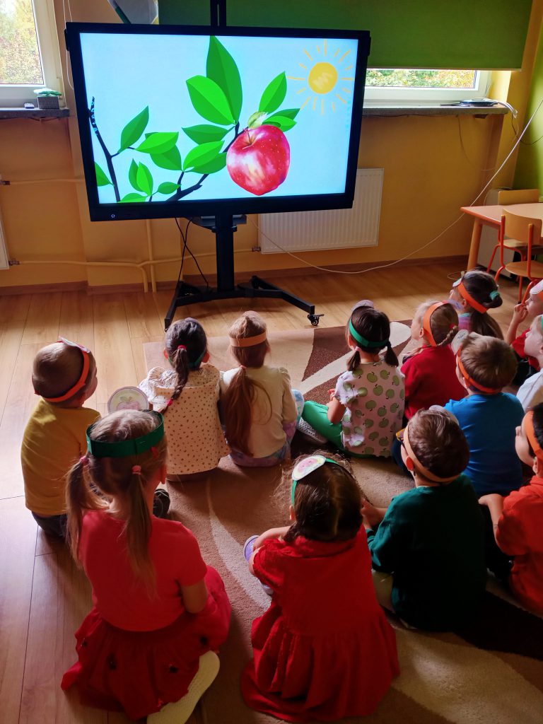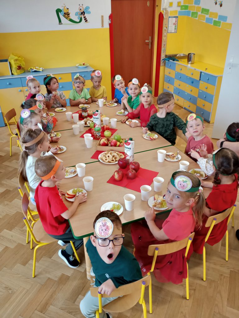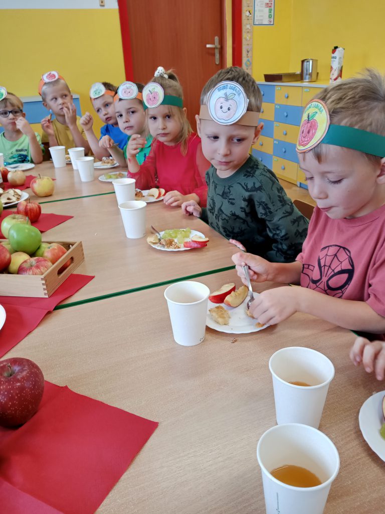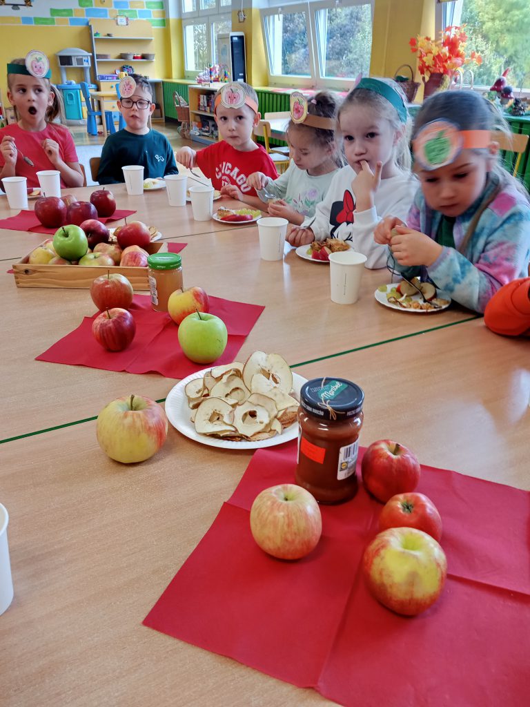 To był dzień pełen jabłkowych wrażeń. Ciekawostki o jabłkach, zabawa przy piosence „Małe czerwone jabłuszko”, zabawa „Wędrujące jabłko”, Ciepło-zimno, W jabłkowym królestwie ciszy, jabłkowa praca plastyczna oraz mega jabłkowa uczta. Dziękujemy Rodzicom za wszystkie jabłkowe pyszności, a szczególnie za upieczone szarlotki