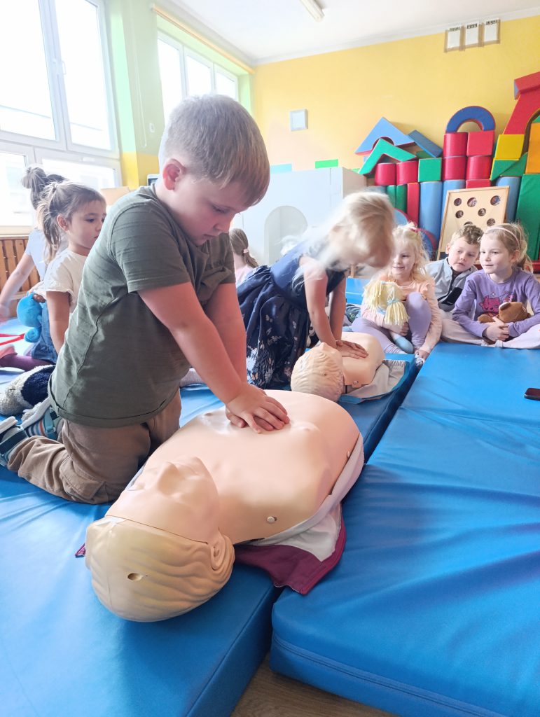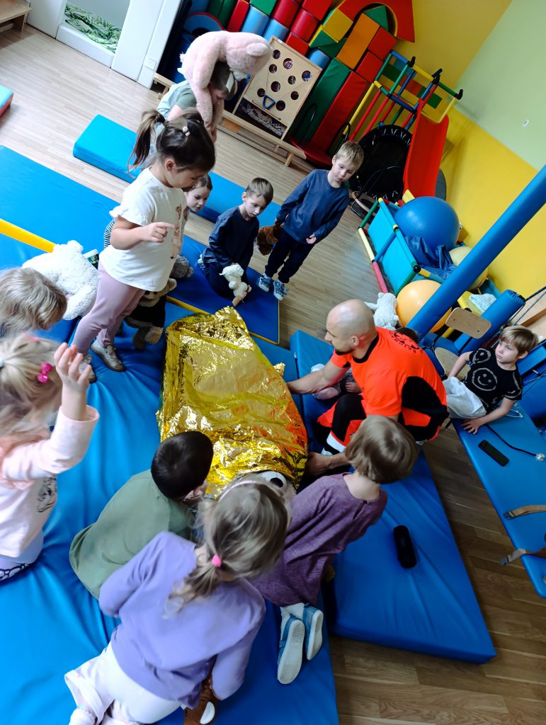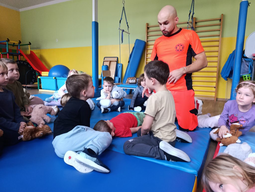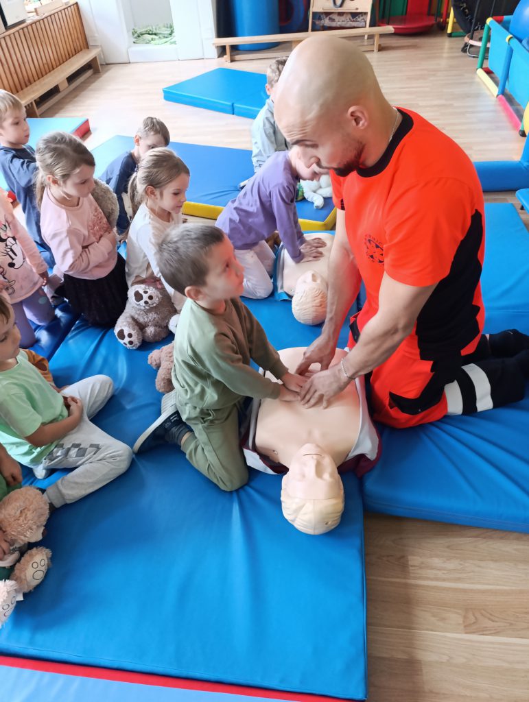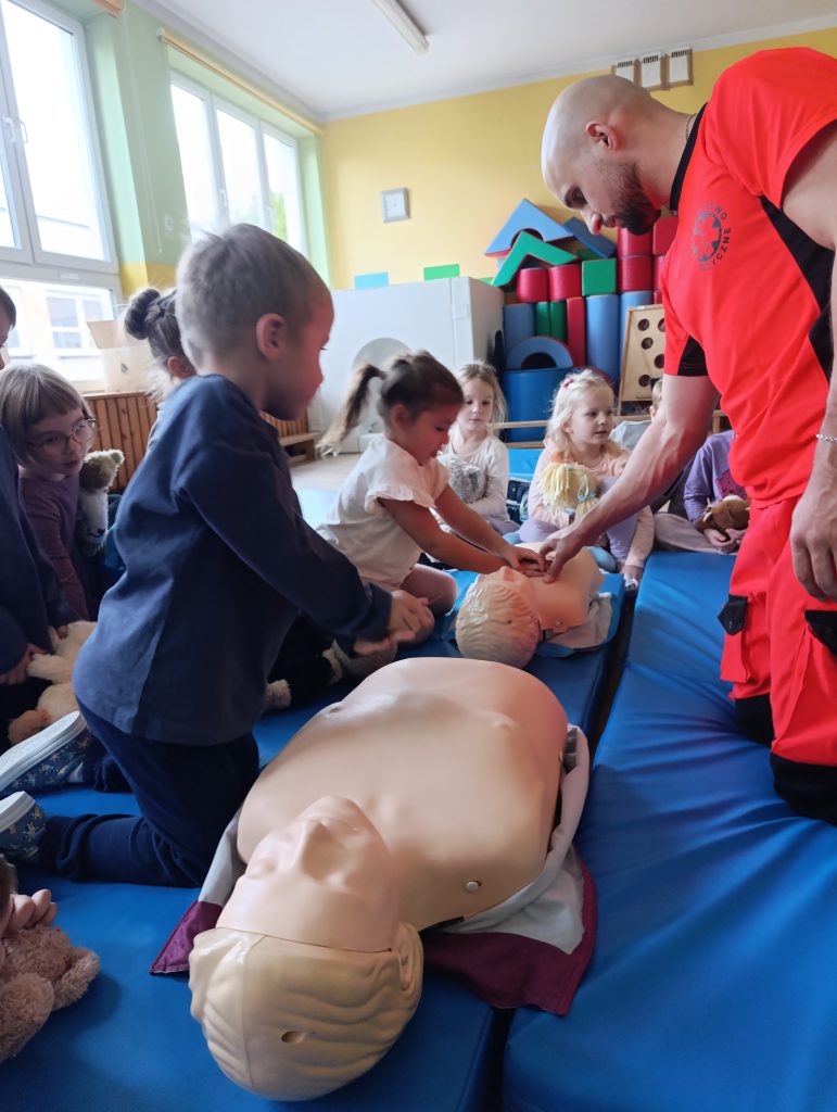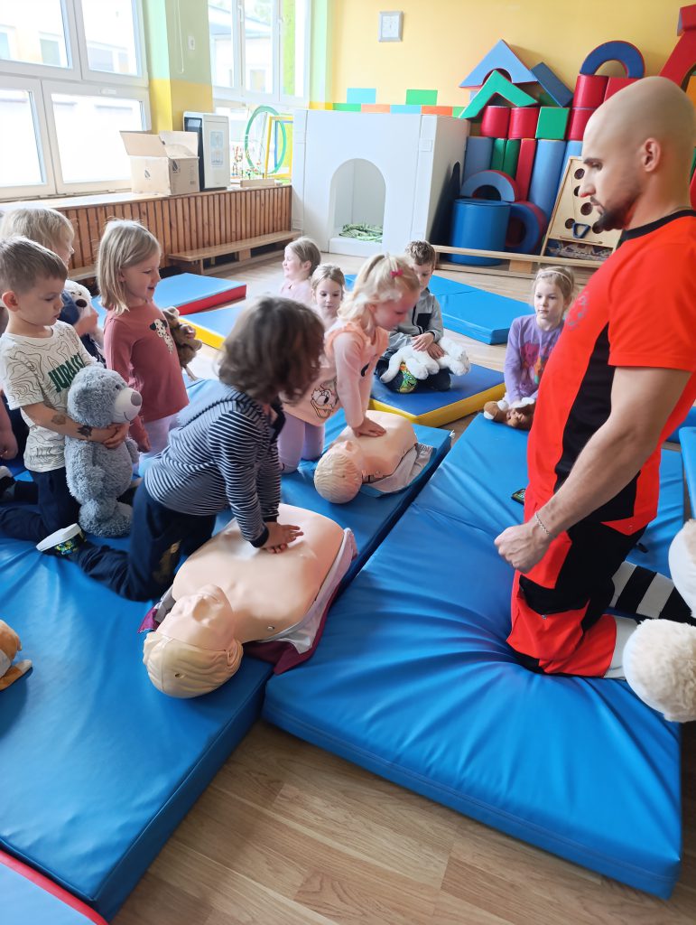 14.10 nasze Przedszkolaki uczestniczyły w warsztatach z pierwszej pomocy z ratownikiem medycznym p. Andrzejem. Przedszkolaki utrwaliły numer alarmowy 112, uczyły się wzywać karetkę pogotowia, rozpoznawać osobę w potrzebie medycznej oraz ćwiczyły na misiach masaż serca. Dzieci wchodziły w rolę ratowników udzielających pomoc oraz rannych. Takie ćwiczenia poprzez zabawę utrwalają schemat pomocy i dają wiele radości Przedszkolakom.