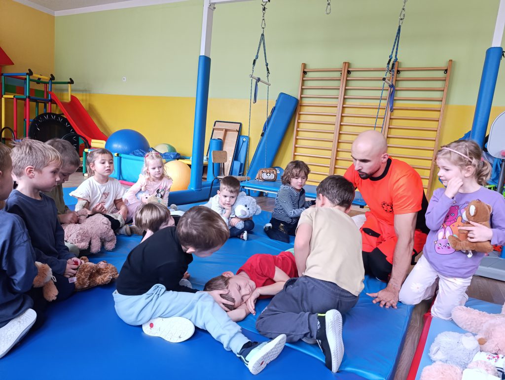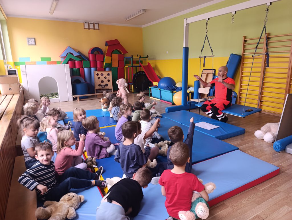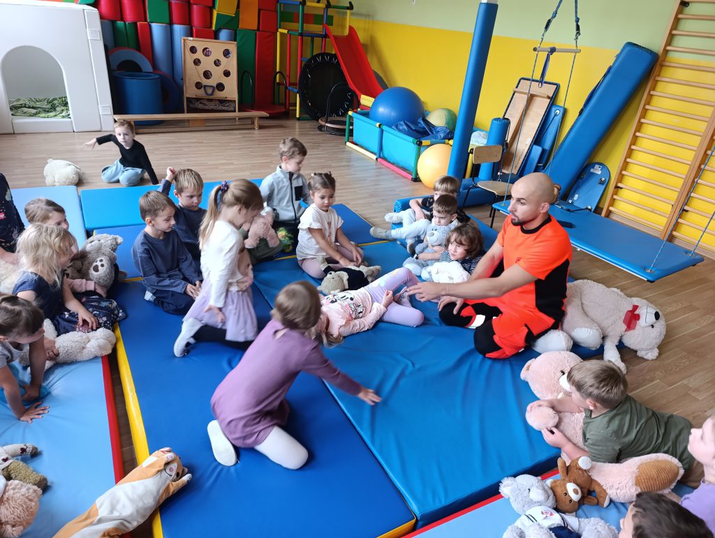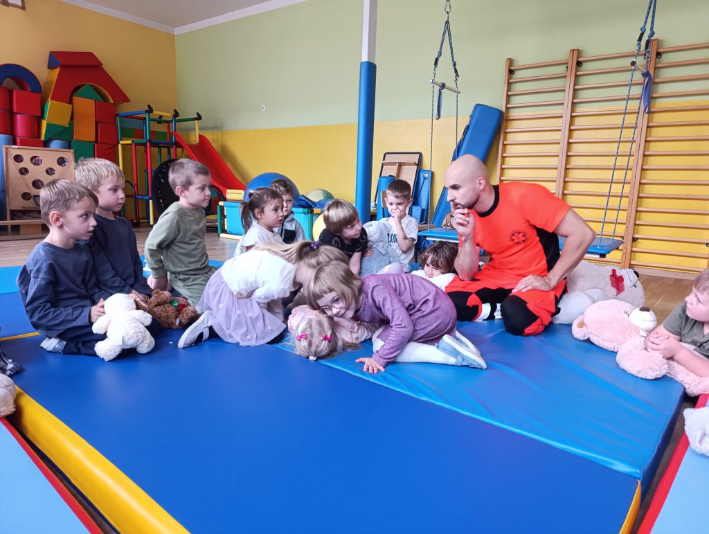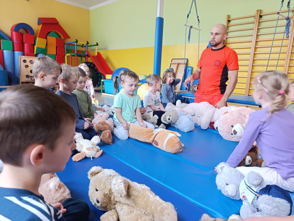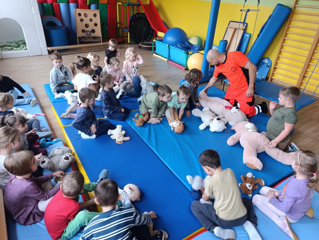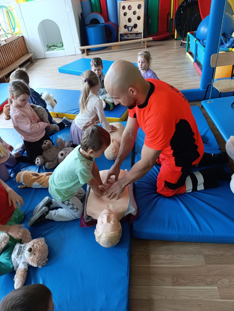 14.10 nasze Przedszkolaki uczestniczyły w warsztatach z pierwszej pomocy z ratownikiem medycznym p. Andrzejem. Przedszkolaki utrwaliły numer alarmowy 112, uczyły się wzywać karetkę pogotowia, rozpoznawać osobę w potrzebie medycznej oraz ćwiczyły na misiach masaż serca. Dzieci wchodziły w rolę ratowników udzielających pomoc oraz rannych. Takie ćwiczenia poprzez zabawę utrwalają schemat pomocy i dają wiele radości Przedszkolakom.