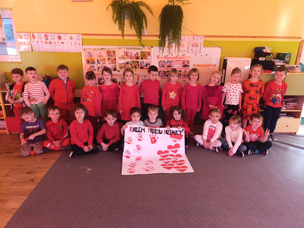 19 listopada Przedszkolaki z Gr 3 założyły czerwone ubrania aby solidaryzować się z wszystkimi dziećmi na świecie i zwrócić uwagę na problem przemocy wobec dzieci. Wspólnie wykonaliśmy plakat pt Razem Wobec Przemocy i rozmawialiśmy nt zachowań miłych i nie miłych wobec dzieci.