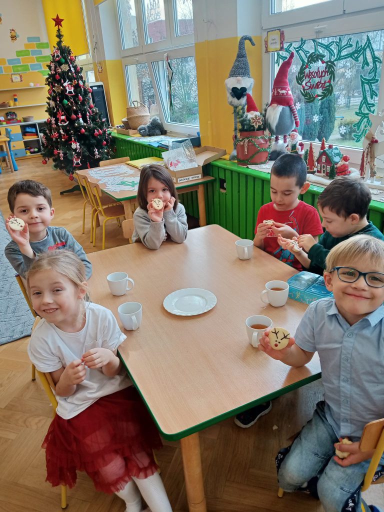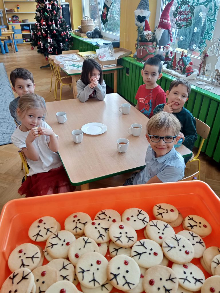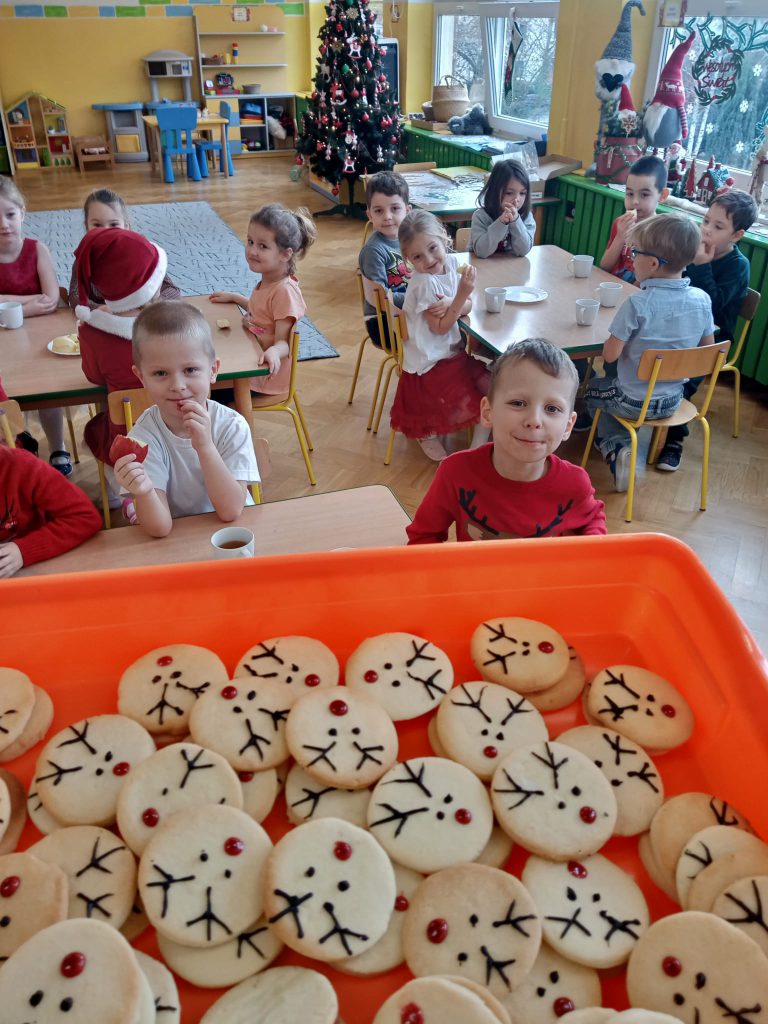 W oczekiwaniu na wizytę Mikołaja, wszystkie dzieci miały też ochotę na ciasteczka- reniferki, upieczone specjalnie na ten dzień przez mamę Mili. A do tego wiele opowieści o Świętym Mikołaju z książek przyniesionych przez dzieci😊🧑🎄