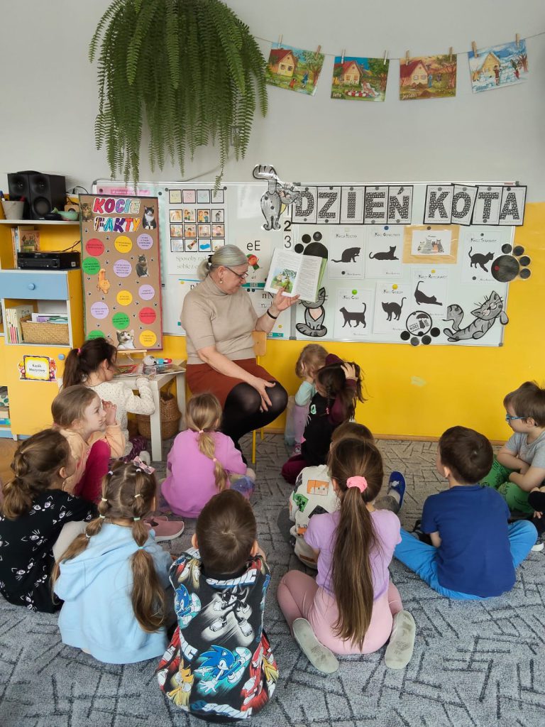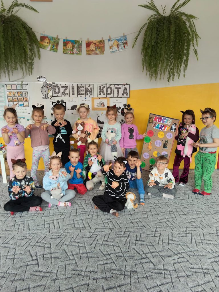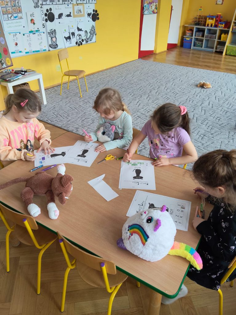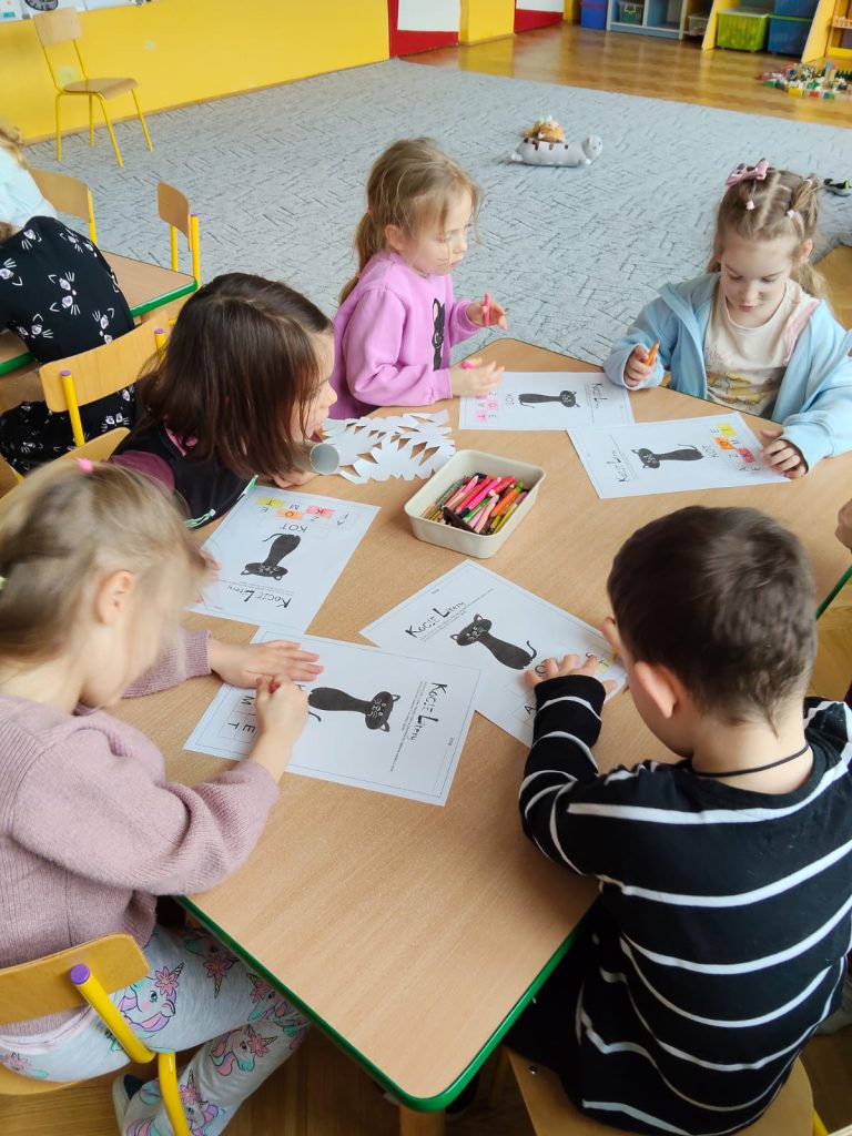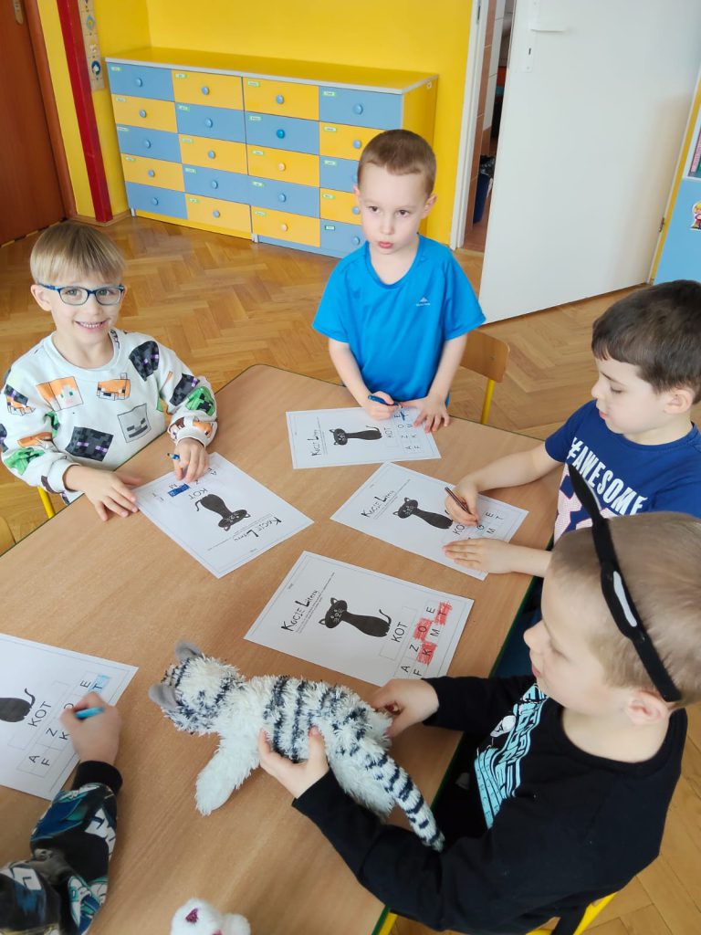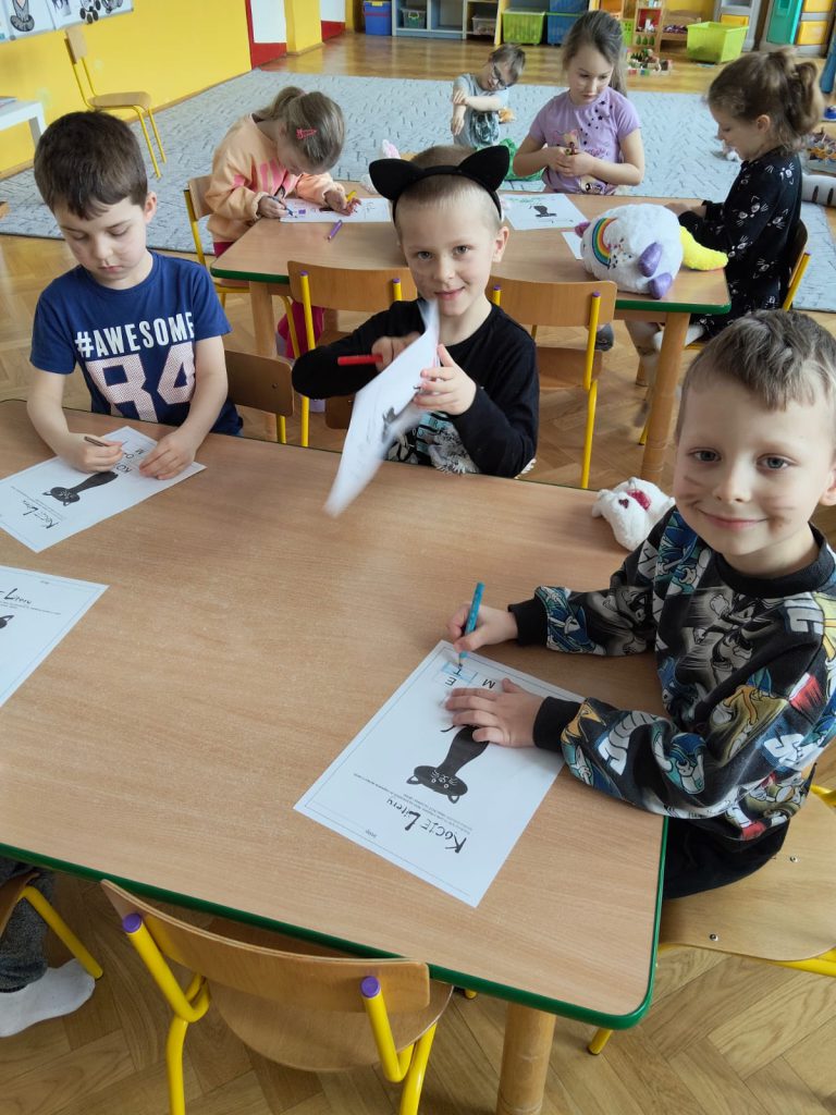 My lubimy koty i wiemy, że należy dbać o zwierzęta. Dzieci poznały ciekawe fakty o kotach, bawiły się przy piosence „My jesteśmy kotki dwa”. Wykonały i złożyły kota z papieru. Poznały kocie litery i szukały kotków, miaucząc jak kotki. Dziękujemy rodzicom za zaangażowanie w przygotowanie