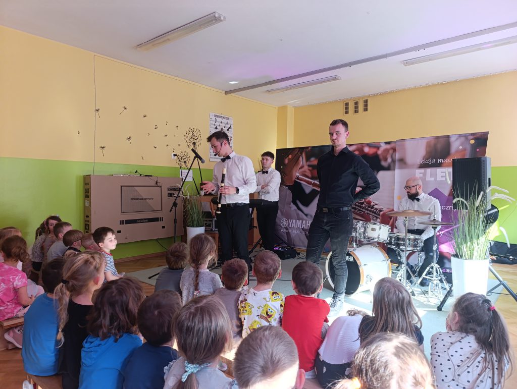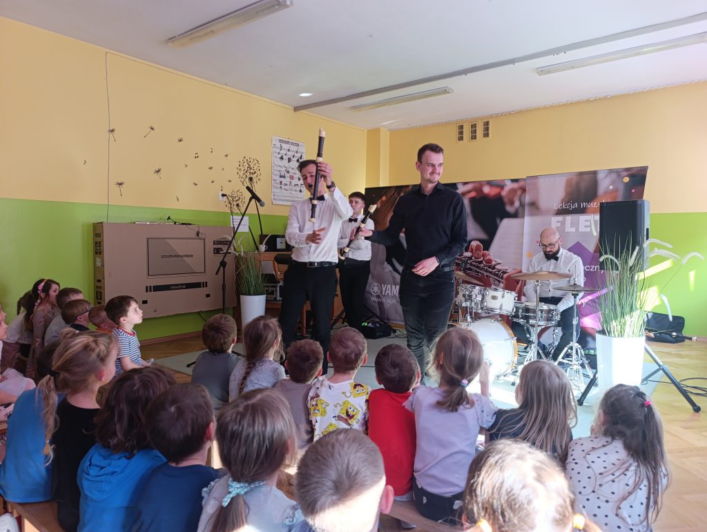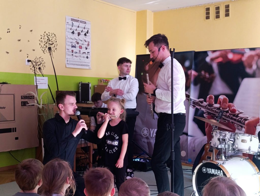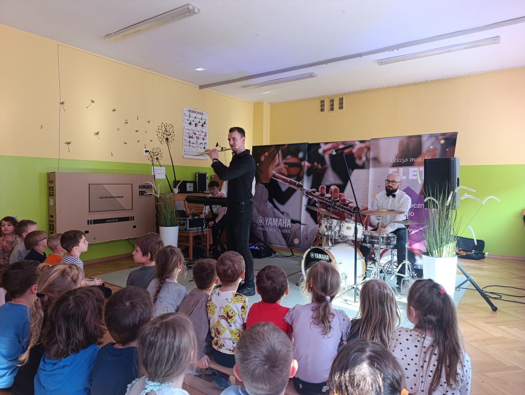 Nasze przedszkole odwiedziła Yamaha Music School dając fantastyczny koncert pełen energii i radości. Pan Przemek wraz ze swoim zespołem i gośćmi Panią Anią i Panem Filipem przedstawili nam rodzinę instrumentów fletów. Przedszkolaki miały okazję grać na różnych rodzajach fletów a nawet tworzyć trio fletowe.